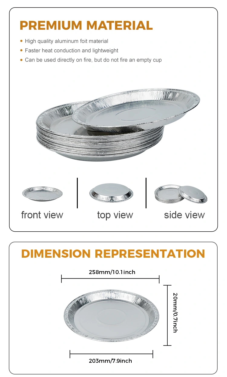 อลูมิเนียมฟอยล์ Yunchu ให้บริการพิซซ่าอลูมิเนียมฟอยล์อลูมิเนียมขนาด 10 นิ้วที่มีหมายเลขรุ่น 13110 ผลิตภัณฑ์มีเส้นผ่านศูนย์กลางส่วนบน 258 มม. (ประมาณ 10.1 นิ้ว) เส้นผ่านศูนย์กลางที่ต่ำกว่า 203 มม. (ประมาณ 7.9 นิ้ว) และความสูง 20 มม. (ประมาณ 0.7 นิ้ว) ด้วยความจุประมาณ 695 มล. (ประมาณ 24.5 ออนซ์) เหมาะสำหรับการอบพิซซ่าโดยไม่ต้องติดง่ายต่อการปล่อยจากแม่พิมพ์และไม่มีกลิ่น นอกจากนี้การออกแบบขอบที่เพิ่มขึ้นช่วยป้องกันส่วนผสมจากการหกและเพิ่มการใช้งานจริง นอกจากนี้เรายังสามารถให้บริการปรับแต่งโลโก้เพื่อช่วยให้ลูกค้าประทับใจและปรับปรุงการรับรู้แบรนด์ของคุณให้ลึกซึ้งยิ่งขึ้น