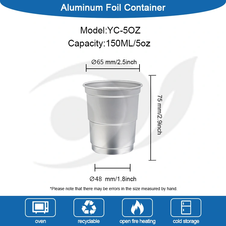 Yunchu อลูมิเนียมฟอยล์ซัพพลายเออร์ 5oz เครื่องดื่มเย็นรีไซเคิลแบบใช้แล้วทิ้งถ้วยเครื่องดื่มอลูมิเนียมทำจากอลูมิเนียมคุณภาพสูง พวกเขาผ่านกระบวนการตรวจสอบผลิตภัณฑ์สำเร็จรูปอย่างเข้มงวดเพื่อให้แน่ใจว่าไม่มีสารอันตรายถูกปล่อยออกมาและเป็นไปตามมาตรฐานความปลอดภัยเกรดอาหาร ทำให้ทุกจิบปลอดภัยและไร้กังวล ตัวถ้วยใช้กระบวนการยืดที่แม่นยำเพื่อให้ได้ความหนาสม่ำเสมอและความแข็งแกร่งที่โดดเด่น มีน้ำหนักเบาและพกพาสะดวกแต่ไม่เสียรูปง่าย