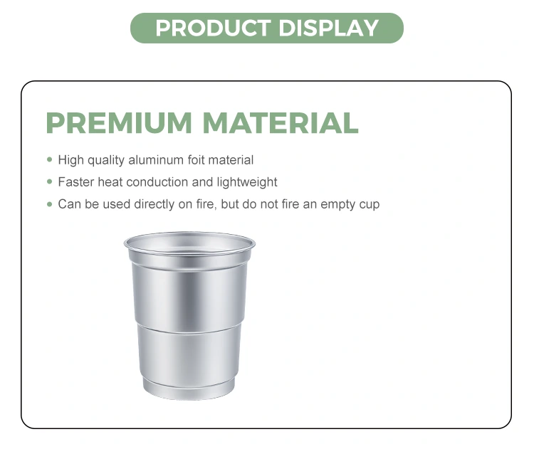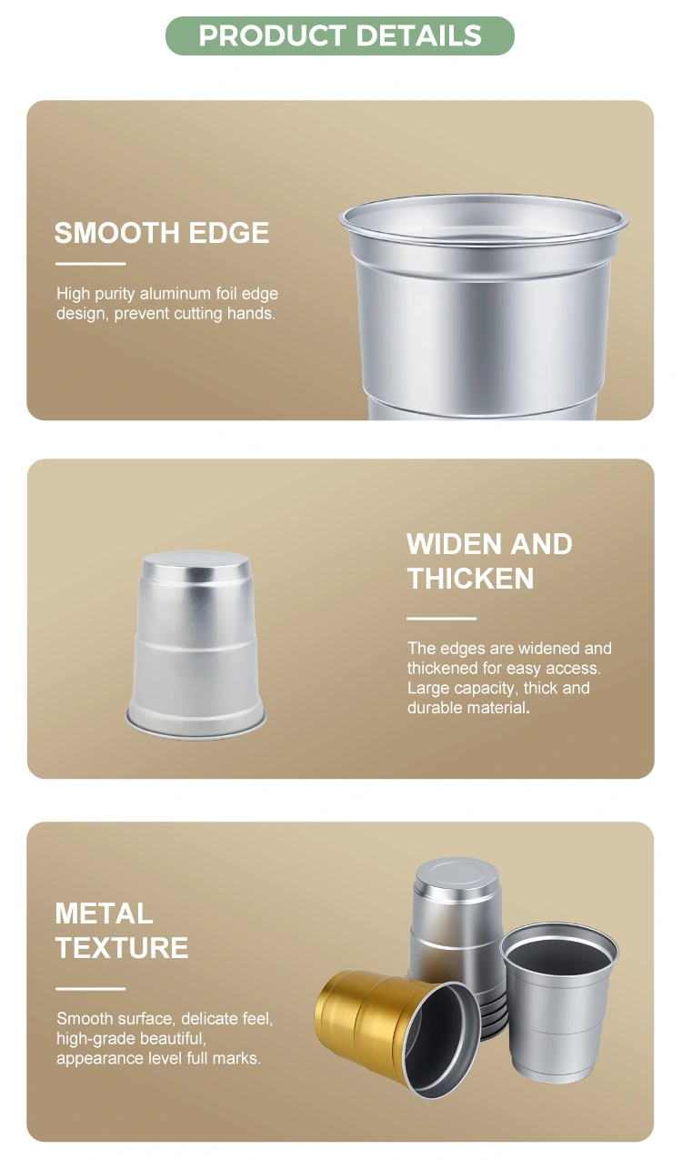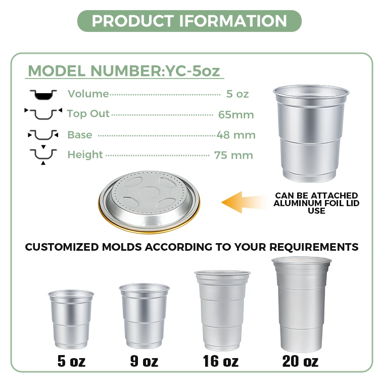 ถ้วยเครื่องดื่มอลูมิเนียมเครื่องดื่มเย็นแบบใช้แล้วทิ้งของซัพพลายเออร์ Yunchu อลูมิเนียมฟอยล์ขนาด 5 ออนซ์พร้อมพื้นผิวโลหะอลูมิเนียมที่เรียบง่ายและสง่างาม ทำให้ถ้วยเครื่องดื่มนี้เหมาะสำหรับสถานการณ์ที่หลากหลาย ครอบคลุมหลายสาขา เช่น การดำเนินการเชิงพาณิชย์ การรวมตัวเพื่อการพักผ่อน กิจกรรมขนาดใหญ่ ฯลฯ กลายเป็นโซลูชันที่ต้องการสำหรับบรรจุภัณฑ์ตามสถานการณ์: