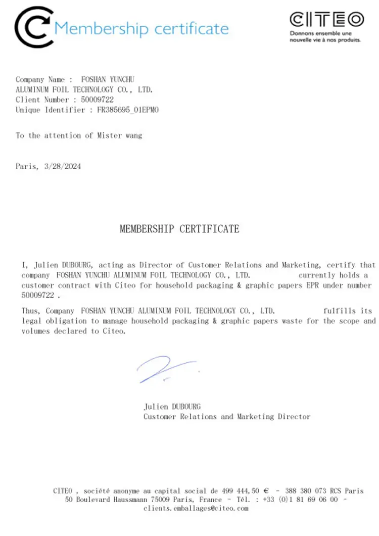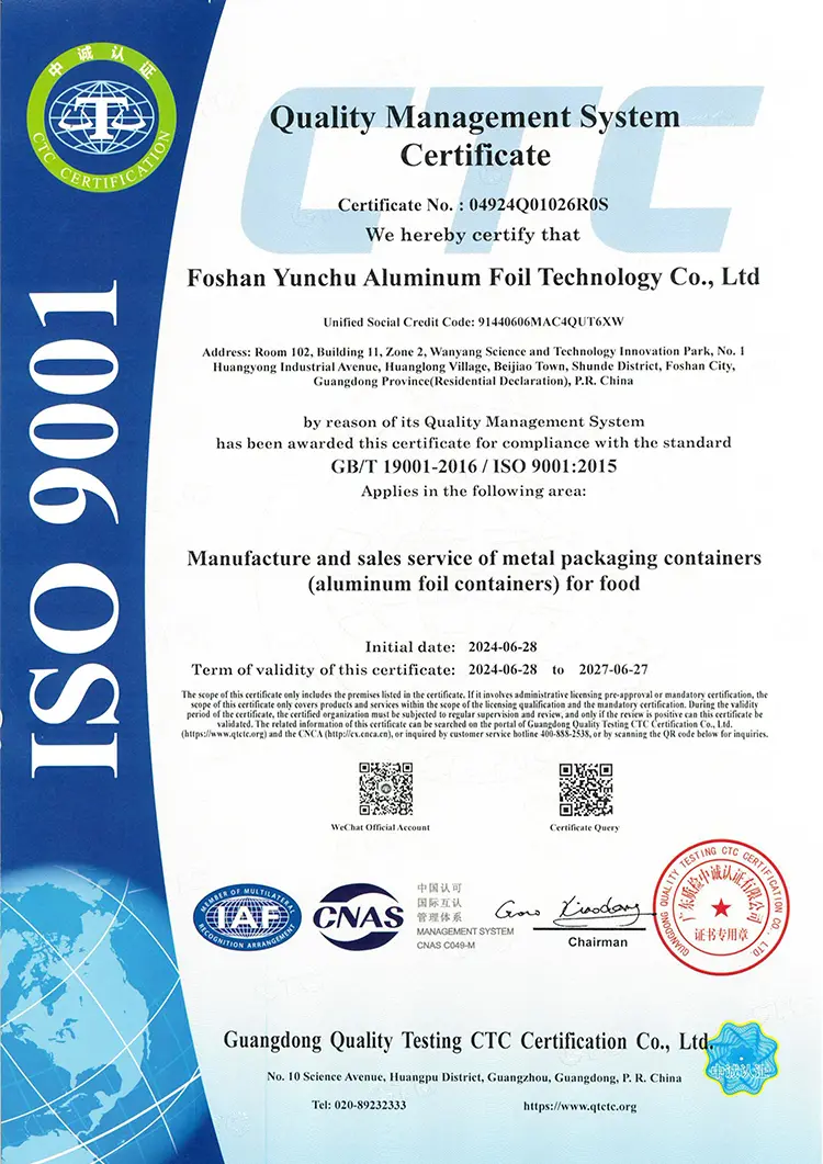 Foshan Yunchu Aluminum Foil Technology Co. , Ltd. ปฏิบัติตามมาตรฐานคุณภาพระหว่างประเทศอย่างเคร่งครัด ผลิตภัณฑ์ของเราได้รับ: