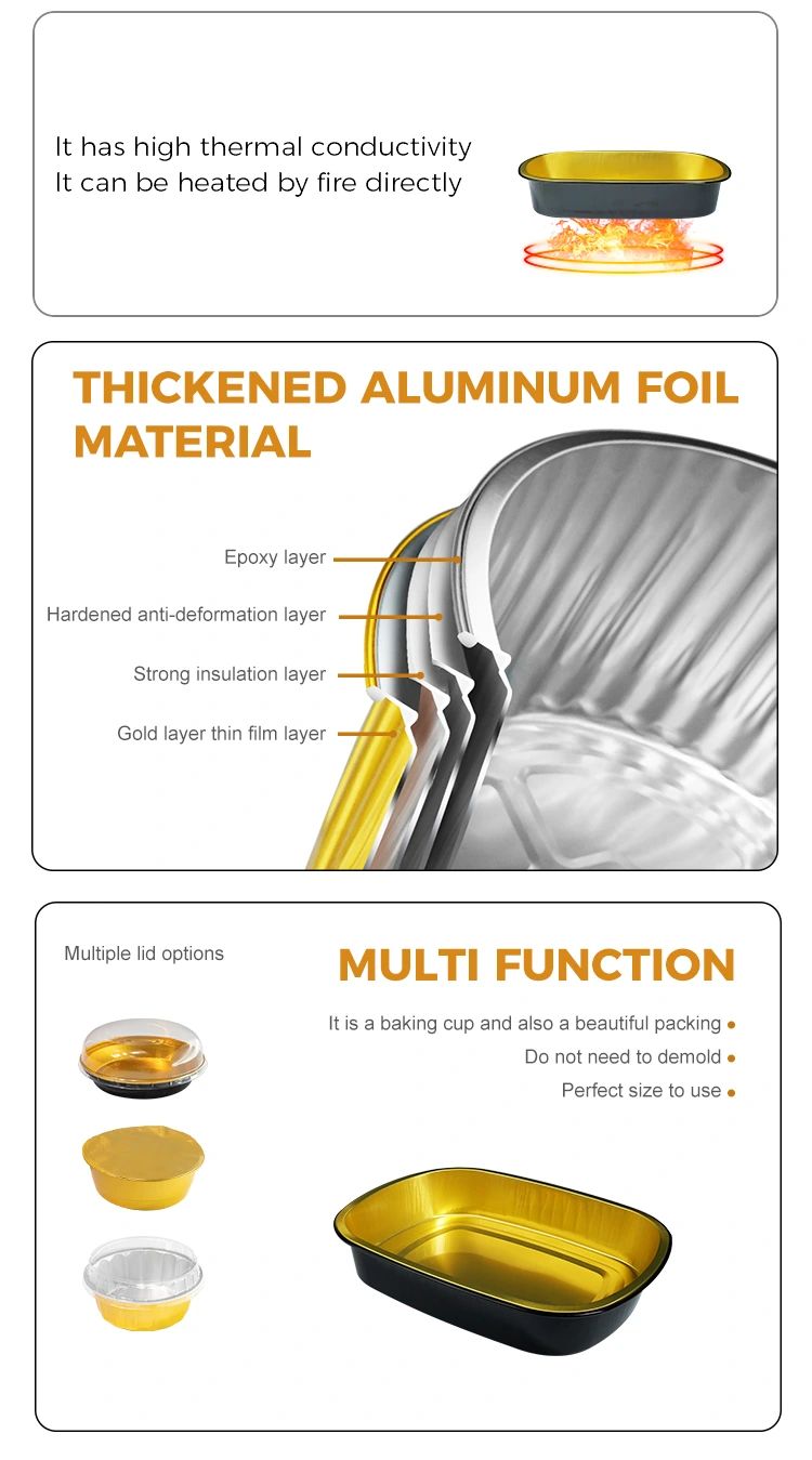 YUNCHU อลูมิเนียมฟอยล์ผู้จัดหาทองคำสีดำจัดเลี้ยงภาชนะบรรจุอลูมิเนียมฟอยล์รูปสี่เหลี่ยมผืนผ้าสี่เหลี่ยมผืนผ้าเหมาะสำหรับอุตสาหกรรมการจัดเลี้ยงขนาดใหญ่และอุตสาหกรรมการซื้อกลับบ้านโดยเฉพาะอย่างยิ่งที่เหมาะสมสำหรับการอบโซ่จัดเลี้ยงและการให้บริการด้วยตนเอง สถานที่สามารถใช้กับฝาปิดการปิดผนึกอลูมิเนียมฟอยล์และ PET ฝาที่โปร่งใสอย่างเต็มที่พร้อมประสิทธิภาพการปิดผนึกที่ยอดเยี่ยมความต้านทานอุณหภูมิสูงและฟังก์ชั่นการป้องกันน้ำมันและการรั่วไหล มีการใช้กันอย่างแพร่หลายในสถานการณ์ต่าง ๆ เช่นบรรจุภัณฑ์อาหารเครื่องทำความร้อนการแช่แข็งและการจัดส่งกลับบ้าน พื้นผิวใช้การออกแบบผนังเบามีลักษณะแบนและราบเรียบซึ่งสะดวกสำหรับการปิดผนึกฟิล์มที่ปิดผนึกด้วยความร้อนอัตโนมัติซึ่งจะช่วยปรับปรุงประสิทธิภาพของบรรจุภัณฑ์