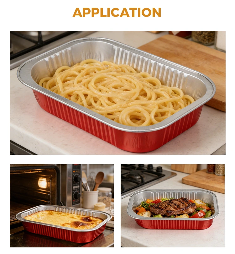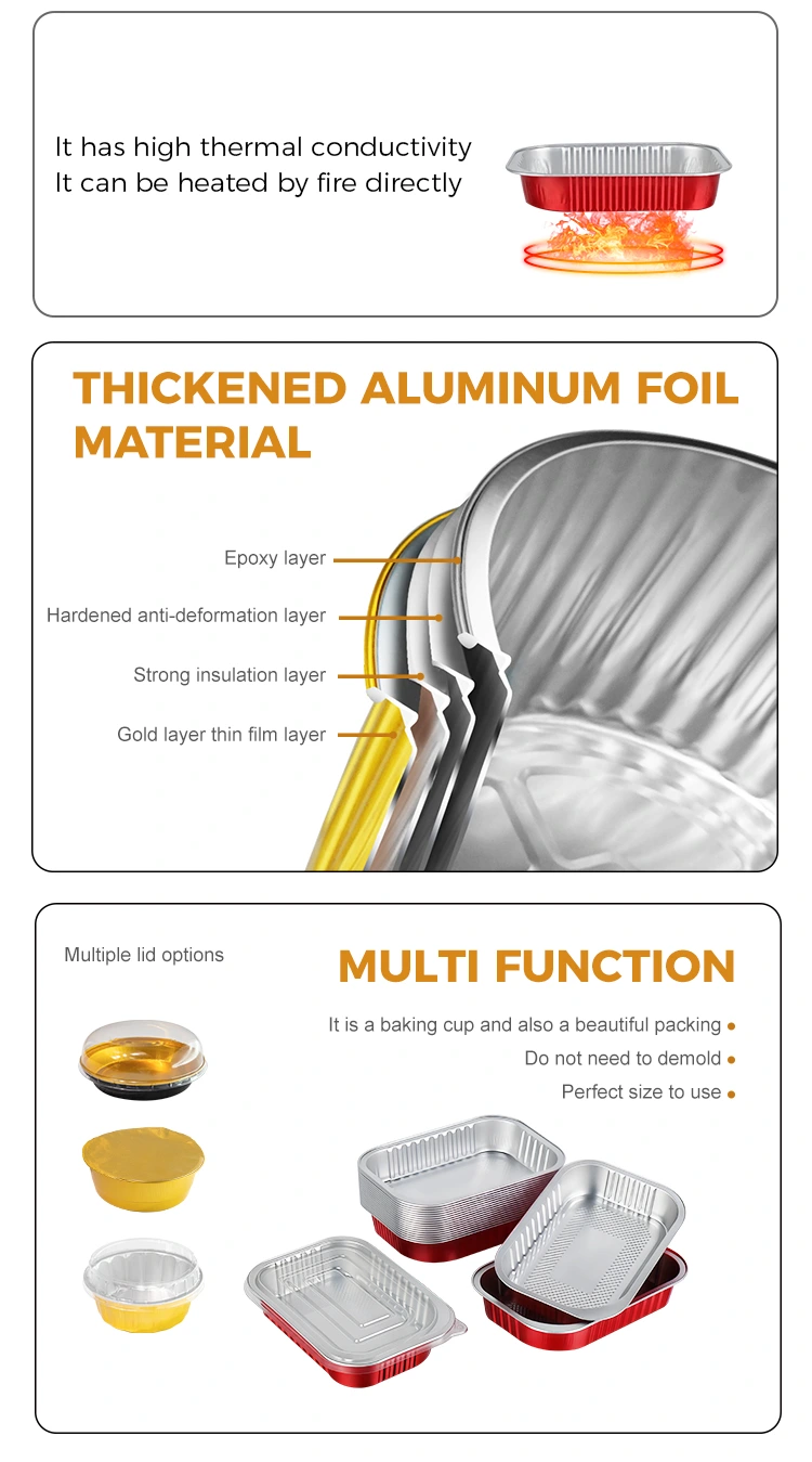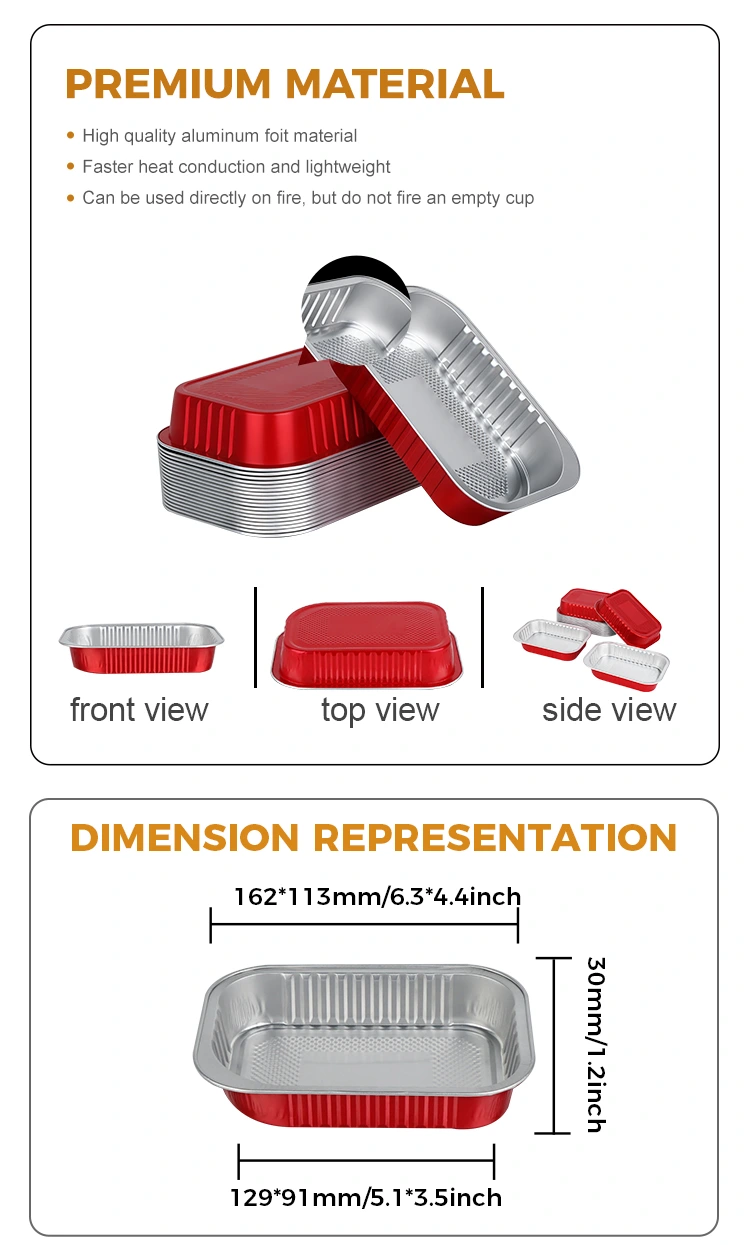 ข้อมูลจำเพาะของภาชนะอลูมิเนียมฟอยล์สี่เหลี่ยมสีแดงสำหรับทำอาหารแบบใช้แล้วทิ้งมีความหลากหลาย (พร้อมตัวเลือกสำหรับความจุที่แตกต่างกัน) ตั้งแต่มื้ออาหารมื้อเล็กๆ ของว่างพิเศษ ไปจนถึงอาหารและซุปสำหรับการสังสรรค์ในครอบครัว ซึ่งทั้งหมดสามารถจับคู่ได้อย่างแม่นยำ คุณสมบัติการใช้งานครั้งเดียวขจัดความจำเป็นในการทำความสะอาด ลดต้นทุนค่าแรงและต้นทุนวัสดุทำความสะอาดสำหรับธุรกิจจัดเลี้ยง นอกจากนี้ยังขจัดความยุ่งยากในการทำความสะอาดหลังมื้ออาหารในสถานการณ์ต่างๆ เช่น การรวมตัวของครอบครัวและกิจกรรมกลางแจ้ง ทำให้มีประสิทธิภาพ สะดวก และปราศจากความเครียด