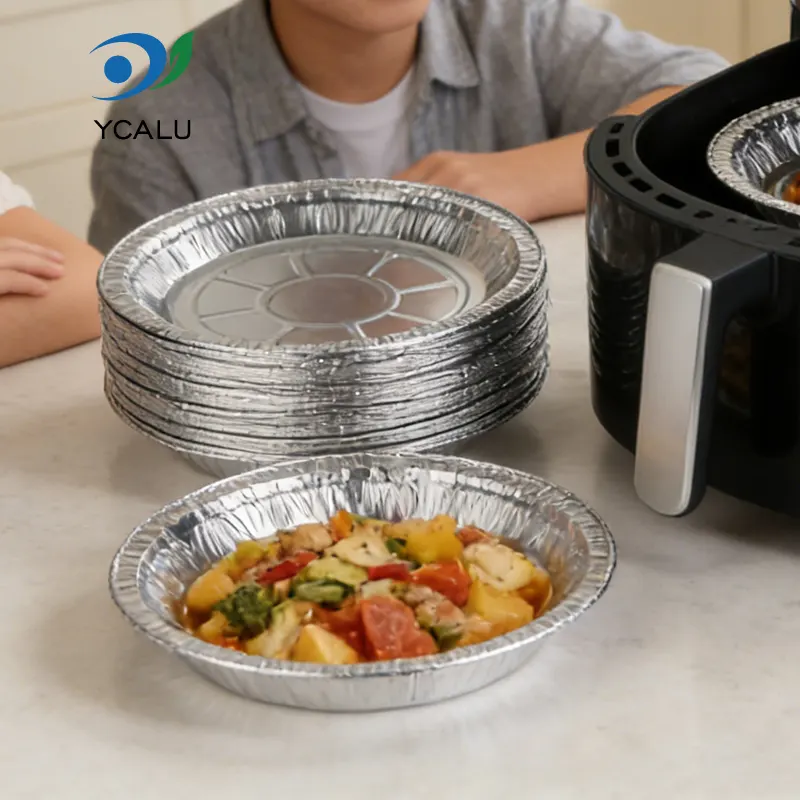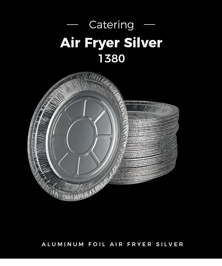 หม้อทอดอากาศแบบดิสก์ใช้แล้วทิ้ง ภาชนะบรรจุอาหารฟอยล์อลูมิเนียมสีเงิน