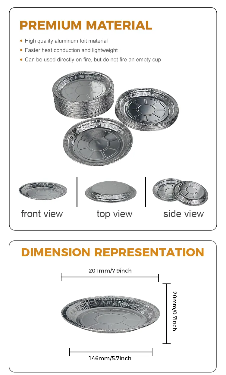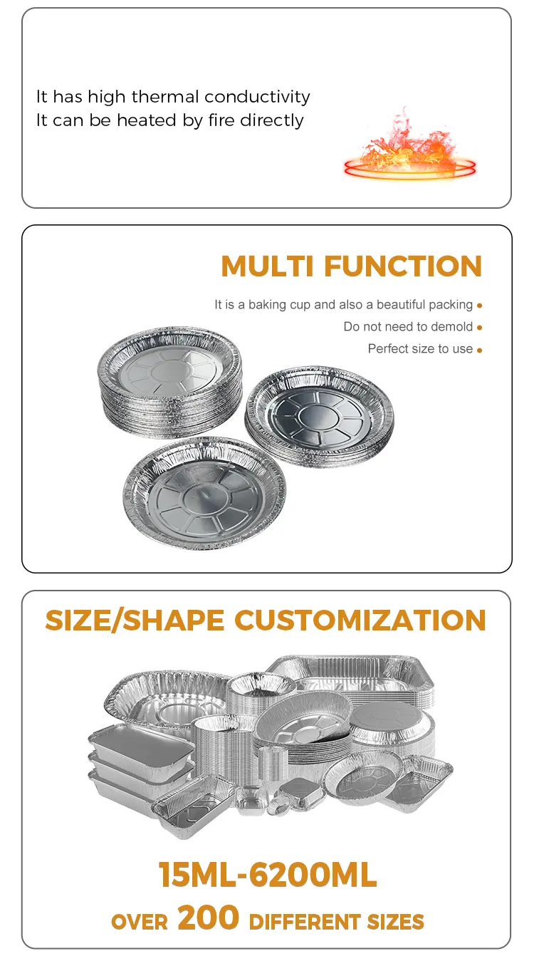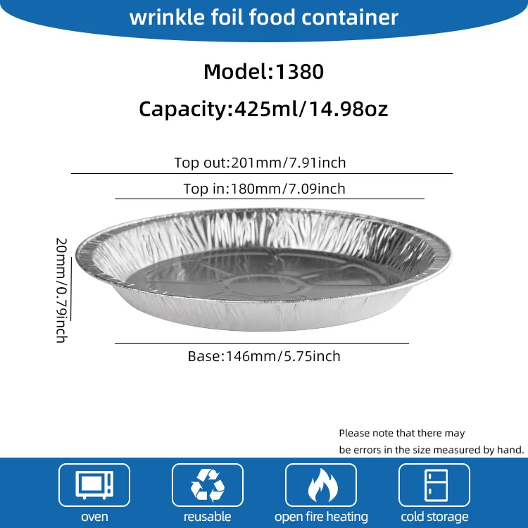 Yunchu อลูมิเนียมฟอยล์ดิสก์แบบใช้แล้วทิ้งหม้อทอดอากาศภาชนะอลูมิเนียมฟอยล์สีเงินนั้นถูกสุขลักษณะและเป็นมิตรกับสิ่งแวดล้อม ทำจากวัสดุที่มีความหนาและทนต่อการกัดกร่อนซึ่งไม่เสียรูปง่ายและสามารถสัมผัสโดยตรงกับอาหารได้ ไม่กลัวอุณหภูมิสูง ไม่ไหม้ ไม่ไหม้ และไม่ทิ้งง่าย สามารถทนต่ออุณหภูมิสูงถึง 250°C และเหมาะสำหรับวิธีการปรุงอาหารต่างๆ เช่น การอบ เตาอบ และบาร์บีคิวที่อุณหภูมิสูง จึงไม่ต้องกังวล มีข้อกำหนดหลายประการเพื่อตอบสนองความต้องการการอบที่หลากหลายในขนาดต่างๆ ช่วยให้คุณสามารถรับมือกับข้อกำหนดในการผลิตอาหารต่างๆ ได้อย่างง่ายดาย