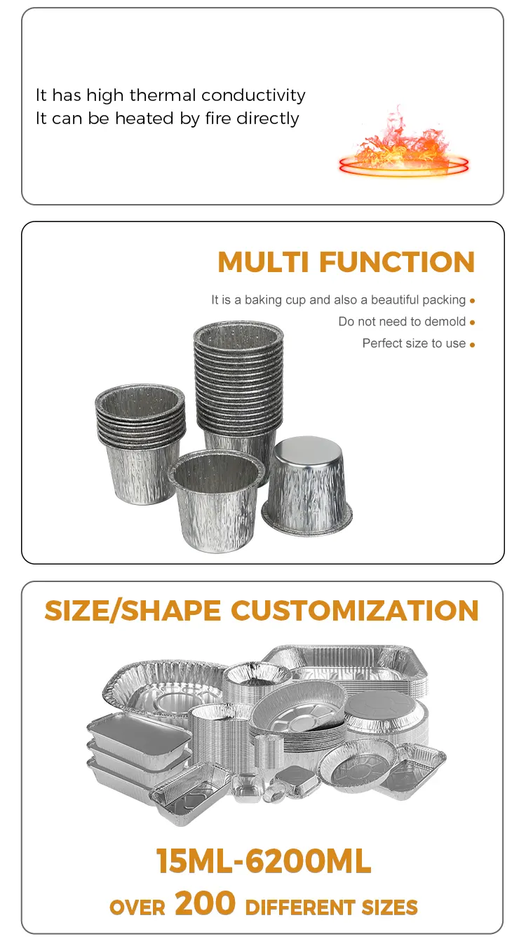 แท็กยอดนิยม: ถ้วยเค้กทรงกลมแบบใช้แล้วทิ้งสีเงินอลูมิเนียมฟอยล์ภาชนะบรรจุอาหาร