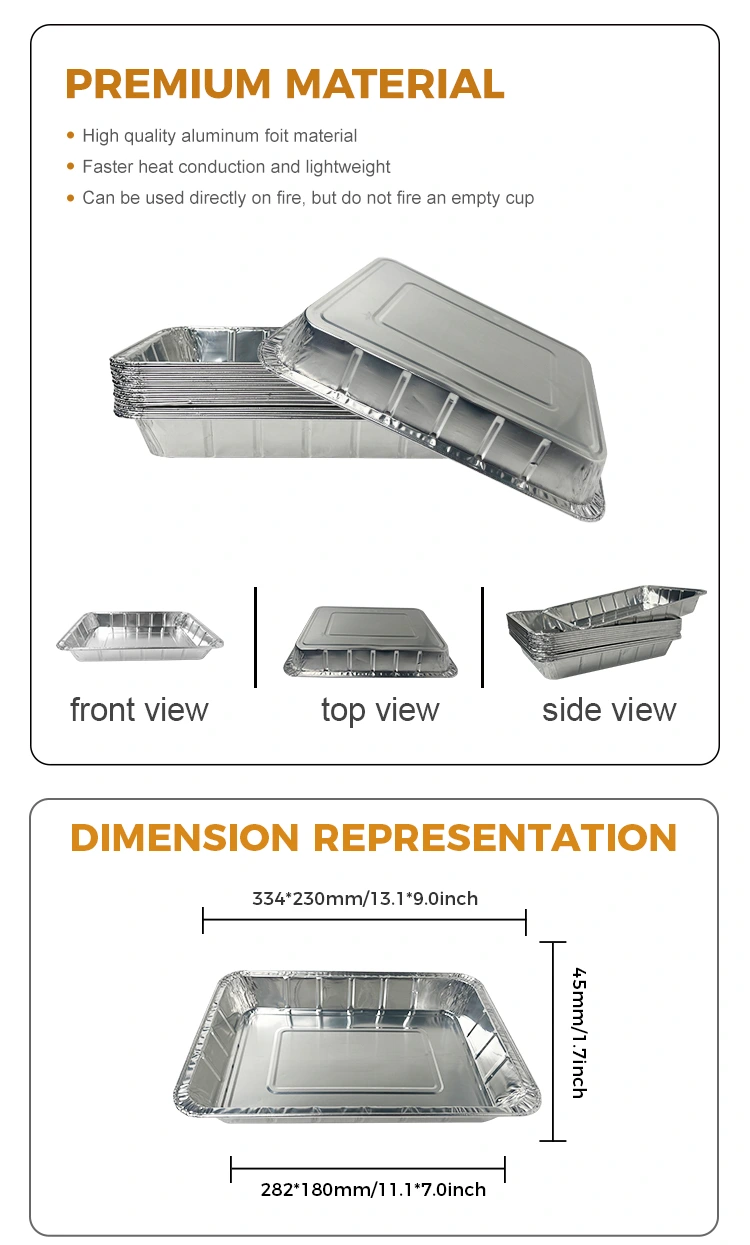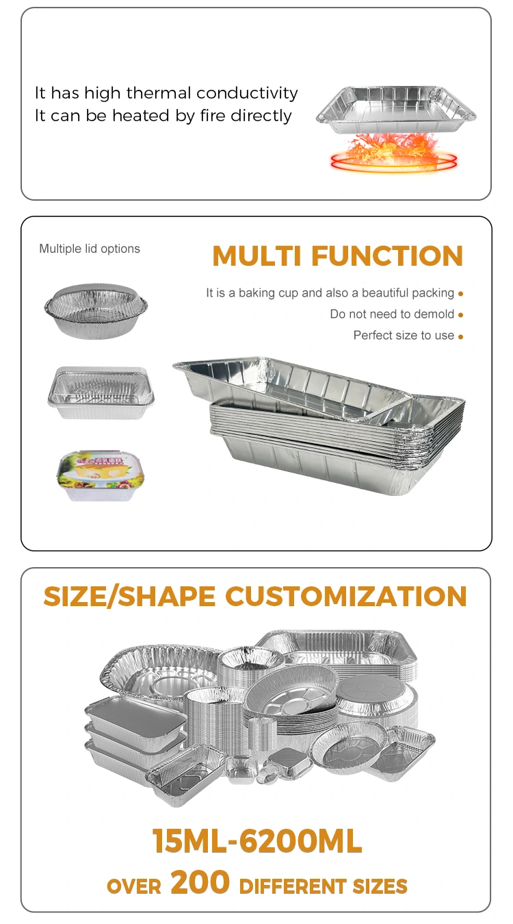 Yunchu อลูมิเนียมฟอยล์ซัพพลายเออร์ปลาย่างขนาดใหญ่ซื้อสินค้าอลูมิเนียมฟอยล์ฟอยล์สีเงินตรงตามความต้องการการปรุงอาหารที่หลากหลายเหมาะสำหรับโอกาสต่าง ๆ เช่นหม้อทอดอากาศ, ย่างบาร์บีคิว, เตาอบโรซิสเซอร์และการทำอาหารทะเล ภาชนะฟอยล์อลูมิเนียมนี้ได้รับการออกแบบมาเป็นพิเศษด้วยขอบที่ยกขึ้นเพื่อป้องกันไม่ให้อาหารทะลักและติดกับผนังหม้ออย่างมีประสิทธิภาพและปกป้องซับแพนด้วยหลายชั้นซึ่งใช้งานได้จริงและปราศจากความกังวล มันทำจากวัสดุระดับ 8011-0 อาหารที่มีอุณหภูมิทนความร้อนสูงถึง 520 ° C ไม่ไหม้เกรียมหรือแตกและวัสดุที่หนาทำให้ไม่สามารถเปลี่ยนรูปได้ง่าย กล่องฟอยล์อลูมิเนียมหนาขึ้นโดยรวมดังนั้นคุณสามารถหยิบมันขึ้นมาได้อย่างง่ายดายหลังจากทำอาหารโดยไม่ต้องกังวลเกี่ยวกับการเสียรูประหว่างการใช้งาน การออกแบบที่ล้อมรอบทำให้สะดวกในการถือและขอบจะโค้งมนดังนั้นคุณไม่ต้องกังวลเกี่ยวกับการเกานิ้วของคุณ ขอบเรียบจะได้รับการเสริมด้วยฝาปิดที่โปร่งใสอย่างเต็มที่และฝาฟอยล์ฟอยล์อลูมิเนียมทำให้เหมาะสำหรับวิธีการปรุงอาหารที่หลากหลายมากขึ้น