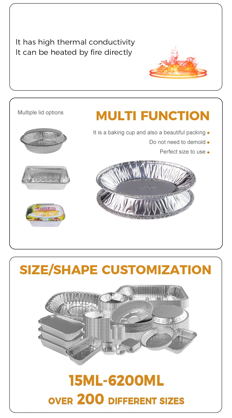 คุณสมบัติ: การขึ้นรูปชิ้นเดียวที่มีความหนาและทนต่อการอบใช้วัสดุฟอยล์อลูมิเนียมเกรดการสัมผัสอาหารได้อย่างมั่นใจในการติดต่ออาหารไม่ง่ายต่อการเสียรูปและไม่รั่วไหลความหนาที่แข็งแรงความต้านทานการกัดกร่อนความต้านทานอุณหภูมิสูง