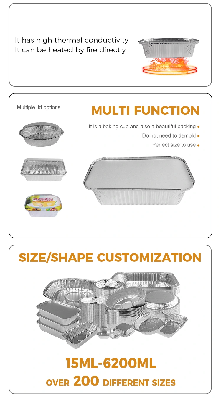 ผู้จัดหาอลูมิเนียมฟอยล์ Yunchu ไม่เพียง แต่ให้บริการเครื่องทอดอากาศสี่เหลี่ยมบรรจุภัณฑ์อลูมิเนียมฟอยล์สีเงิน แต่ยังเปิดตัวผลิตภัณฑ์บรรจุภัณฑ์อื่น ๆ อีกมากมายเพื่อตอบสนองความต้องการของตลาดที่แตกต่างกัน ตัวอย่างเช่นพวกเขายังนำเสนอภาชนะอลูมิเนียมฟอยล์สีเงินรอบซึ่งได้รับรางวัลตลาดด้วยการออกแบบรอบที่เป็นเอกลักษณ์และสัมผัสที่ทันสมัย นอกจากนี้ซัพพลายเออร์ YUNCHU ยังได้เปิดตัวคอนเทนเนอร์อลูมิเนียมฟอยล์ในขนาดและรูปร่างที่แตกต่างกันเพื่อให้เหมาะกับสถานการณ์การจัดเลี้ยงที่หลากหลายและความต้องการส่วนบุคคล