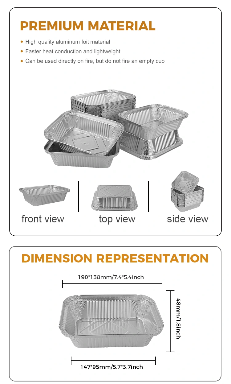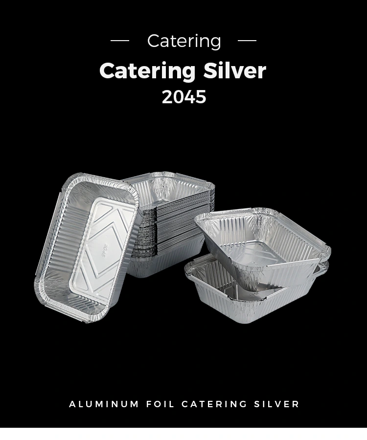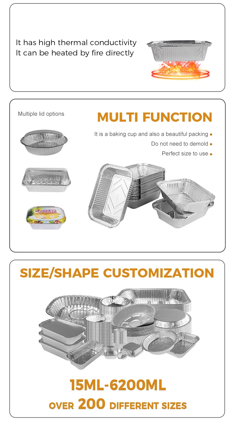 กล่องอาหารกลางวันอลูมิเนียมฟอยล์ที่เรามีทำจากวัสดุอลูมิเนียมฟอยล์ 8011 ซึ่งมีคุณสมบัติเป็นฉนวนความร้อนที่ดีเยี่ยมและสามารถรักษาอุณหภูมิของอาหารได้อย่างมีประสิทธิภาพ โดยเฉพาะอย่างยิ่ง ภาชนะอลูมิเนียมฟอยล์สีเงินสี่เหลี่ยมของเราสำหรับการอบกล่องอาหารกลางวันไม่เพียงแต่มีคุณสมบัติในการเก็บความร้อนเท่านั้น แต่ยังสามารถใช้กับฝาอลูมิเนียมฟอยล์ได้อีกด้วย เพื่ออำนวยความสะดวกในการปรับแต่งโลโก้ส่วนบุคคล