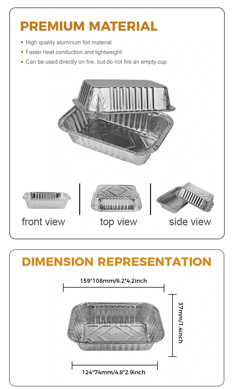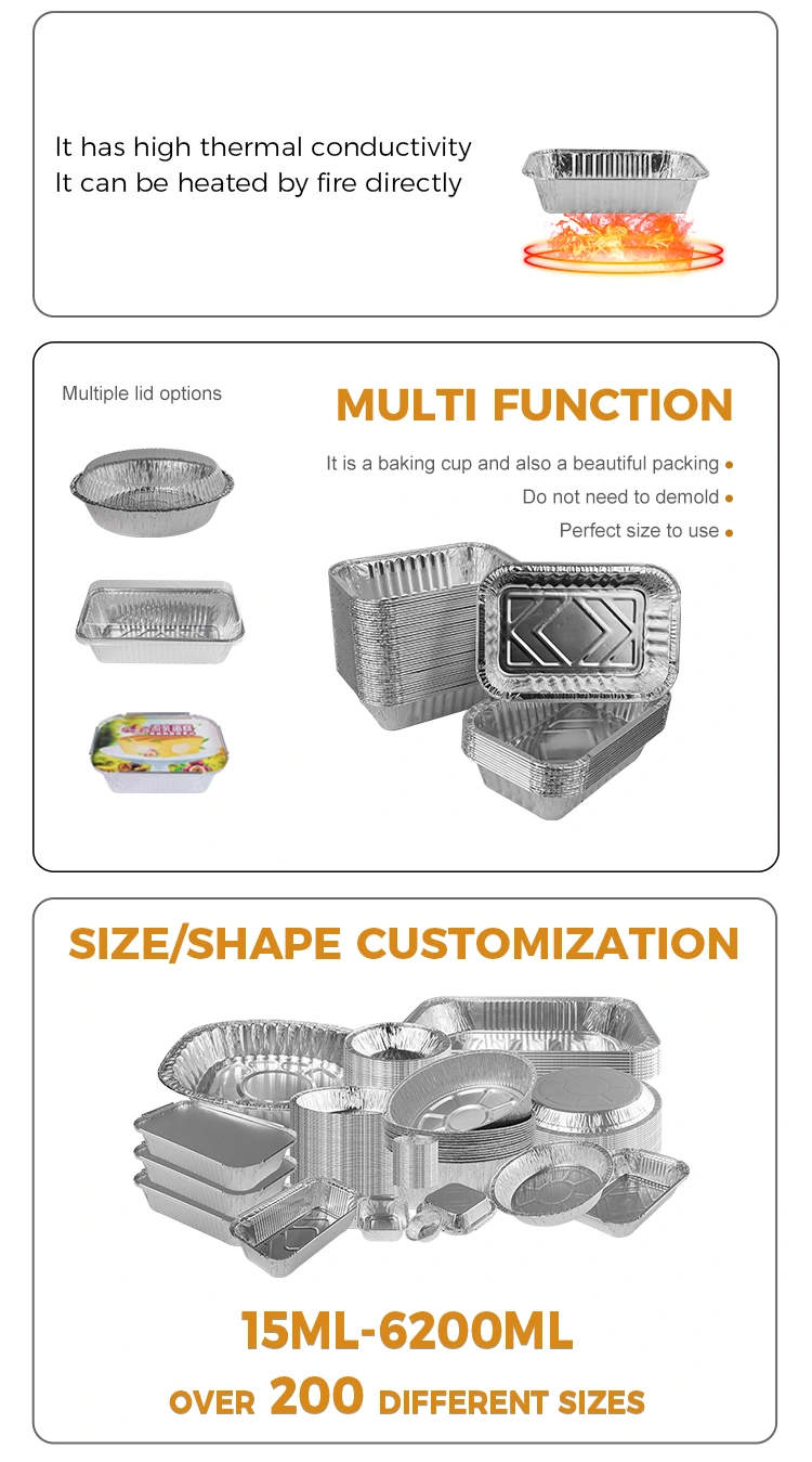 เนื่องจากการออกแบบขนาดเล็กและมีน้ำหนักเบาเค้กสี่เหลี่ยมจัตุรัสนี้อบคอนเทนเนอร์อลูมิเนียมฟอยล์สีเงินนี้เหมาะสำหรับการพกพาและเก็บอาหารเหมาะสำหรับการใช้ร้านขายอาหารและการปรับแต่งในร้านค้าร้านอาหารฟาสต์ฟู้ด ฯลฯ การออกแบบพื้นผิวเว้าและนูนที่ด้านล่างช่วยเพิ่มแรงเสียดทาน มันไม่ลื่นและทนทานและกล่องฟอยล์อลูมิเนียมนั้นหนาและแข็งตัวเพิ่มความสามารถในการทนต่อความดันและยังคงมีเสถียรภาพแม้ในระหว่างการขนส่งและไม่ใช่เรื่องง่ายที่จะเปลี่ยนรูป