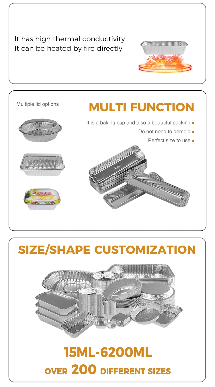 คุณสมบัติ: กล่องอาหารกลางวันขายส่งทำจากวัสดุอลูมิเนียมฟอยล์ 8011 ซึ่งมีผลการเก็บรักษาความร้อนที่ดีและสามารถรักษาอุณหภูมิของอาหารทำให้อาหารอร่อยและอร่อยมากขึ้น นอกจากนี้ภาชนะอลูมิเนียมฟอยล์สีเงินบาร์บีคิวของเรายังมีฟังก์ชั่นฉนวนกันความร้อนและสามารถจับคู่กับฝาอลูมิเนียมฟอยล์และฝาพลาสติก PET