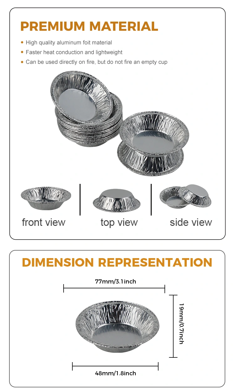 ทาร์ตไข่กลมนี้สำหรับขนมอลูมิเนียมฟอยล์ซิลเวอร์ฟอยล์ทำจากวัสดุฟอยล์อลูมิเนียมเกรดอาหาร 8011 อาหารการสัมผัสเกรดอลูมิเนียมทำให้มั่นใจได้ถึงความปลอดภัยในการสัมผัสกับอาหารไม่ใช่เรื่องง่ายที่จะเปลี่ยนรูปและไม่ง่ายต่อการรั่วไหล ความหนาของมันแข็งแกร่งทนต่อการกัดกร่อนความต้านทานอุณหภูมิสูงและอายุการใช้งานที่ยาวนานขึ้น