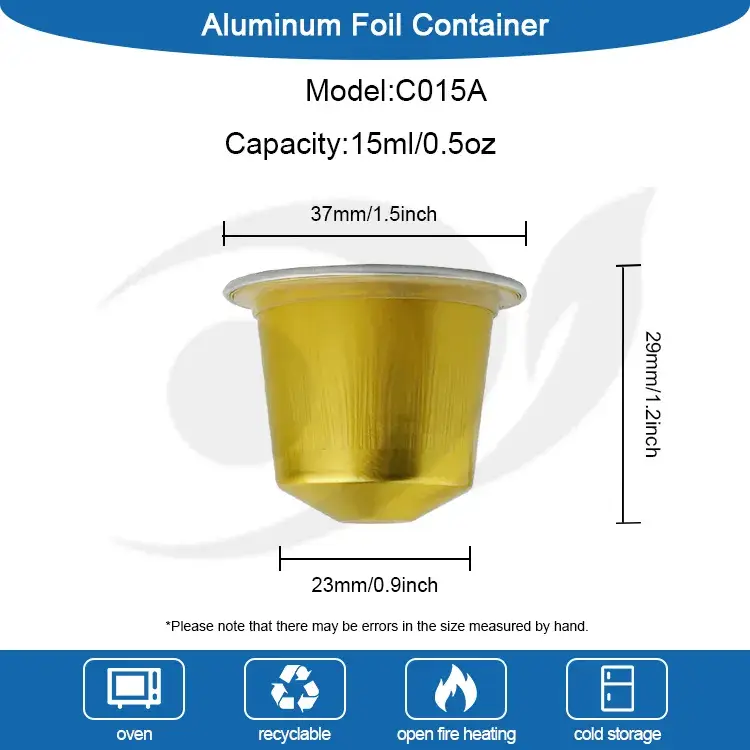 Yunchu อลูมิเนียมฟอยล์ซัพพลายเออร์ซิลิโคน-ปิดผนึกกาแฟแคปซูลเปล่า C015A ในขนาดดังต่อไปนี้: เส้นผ่านศูนย์กลางด้านบน 37 มม. (ประมาณ 1.4 นิ้ว) เส้นผ่านศูนย์กลางฐาน 23 มม. (ประมาณ 0.9 นิ้ว) ความสูง 29 มม. (ประมาณ 1.1 นิ้ว) แคปซูลนี้เก็บกาแฟบด 15 มล. (ประมาณ 0.5 ออนซ์) ของเหลวกาแฟ เหมาะสำหรับเครื่อง Nespresso ทั้งหมดของเหลวเอสเพรสโซที่บรรจุและสามารถขยายได้ด้วยการล้างไนโตรเจน นอกจากนี้โลโก้และสียังสามารถปรับแต่งได้และรูปแบบสามารถพิมพ์บนฝาครอบอลูมิเนียมฟอยล์และโลโก้ยังสามารถประทับที่ด้านล่างของแคปซูลกาแฟ