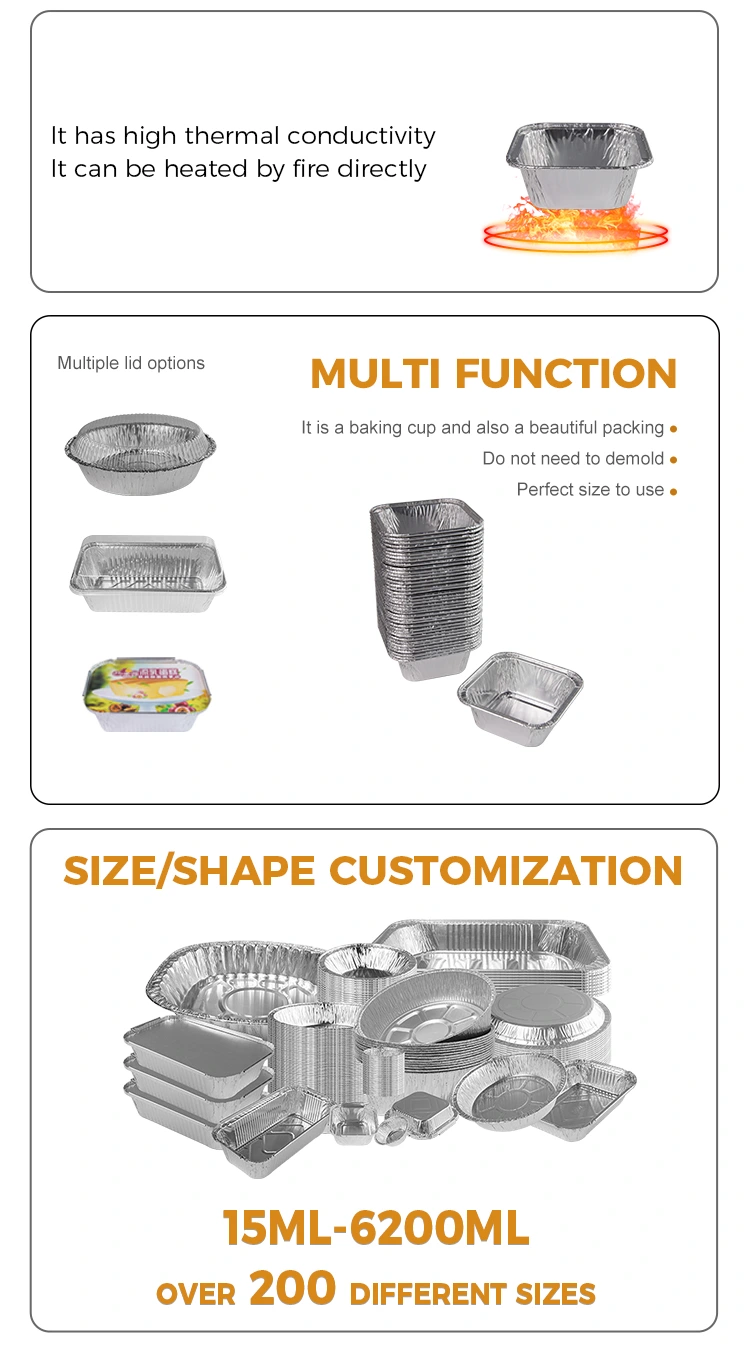 ภาชนะอลูมิเนียมฟอยล์ซิลเวอร์สแควร์สแควร์ใช้วัสดุอลูมิเนียมฟอยล์คุณภาพสูงซึ่งมีทั้งน้ำหนักเบาและทนทาน ด้านบนสามารถปรับแต่งด้วยฝาโปร่งใสสัตว์เลี้ยงและด้านล่างมีฝาปิดที่บีบและจับจ้องอยู่ในกล่องเพื่อป้องกันไม่ให้อาหารติดกับแผ่นอบซึ่งง่ายต่อการปลดปล่อยและทำความสะอาดและง่ายต่อการขนส่งและใช้งาน
