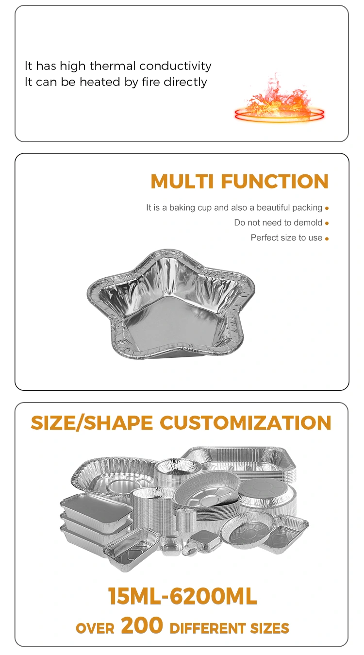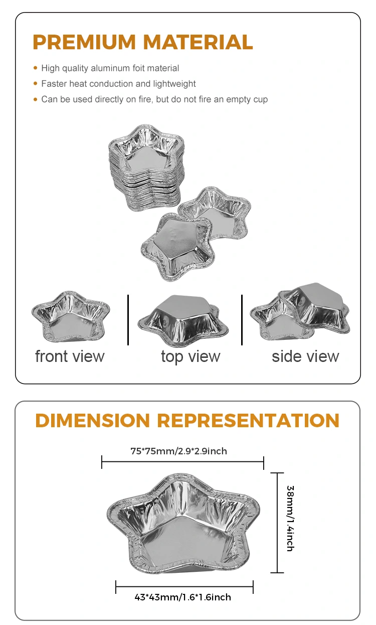 ถ้วยทาร์ตอลูมิเนียมฟอยล์รูปดาวทำจากอลูมิเนียมฟอยล์สีเงินและมีความทนทานต่ออุณหภูมิสูง โดยคงอุณหภูมิได้ระหว่าง -20°C ถึง 300°C เหมาะสำหรับการอบและหม้อทอดอากาศ และสามารถป้องกันความเสียหายต่อผนังด้านในของเครื่องได้ เป็นแบบใช้แล้วทิ้ง ทำให้สะดวกโดยไม่จำเป็นต้องทำความสะอาด
